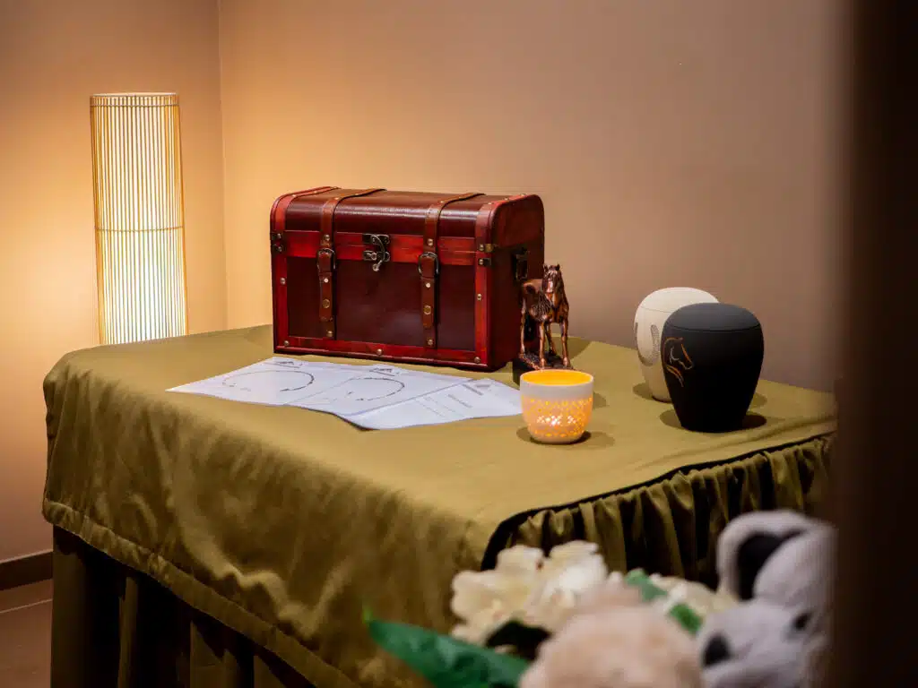 Chacun traverse son deuil à sa manière. Si vous souhaitez faire vos adieux à votre cheval, nous organisons une mise en place sereine de votre cheval sur un lit surélevé dans notre salle d’adieu. Lors de ce moment de recueillement, notre équipe est à vos côtés pour vous accompagner et vous soutenir si vous le souhaitez.