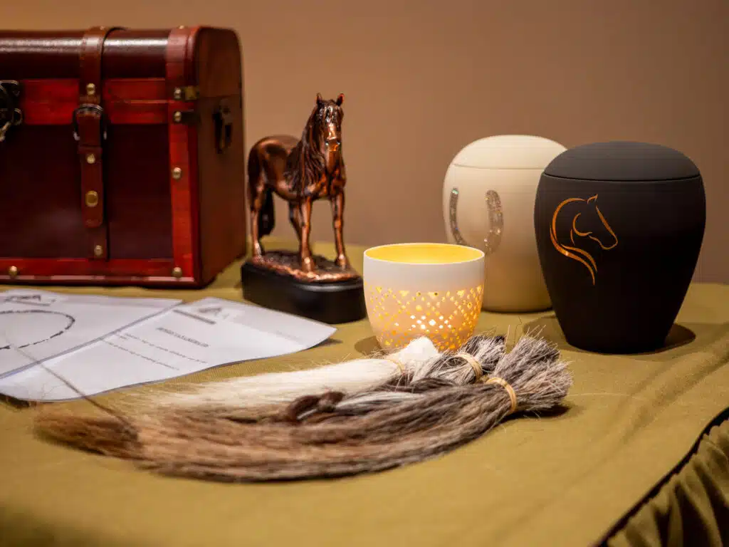 Si vous le souhaitez, nous vous offrons gratuitement une empreinte de sabot à l’encre en souvenir. Nous pouvons également vous remettre la crinière et/ou la queue de votre cheval dans un coffret souvenir, ainsi que ses fers, si vous le souhaitez. Cela vous permet de garder une mémoire tangible de votre compagnon après la crémation.